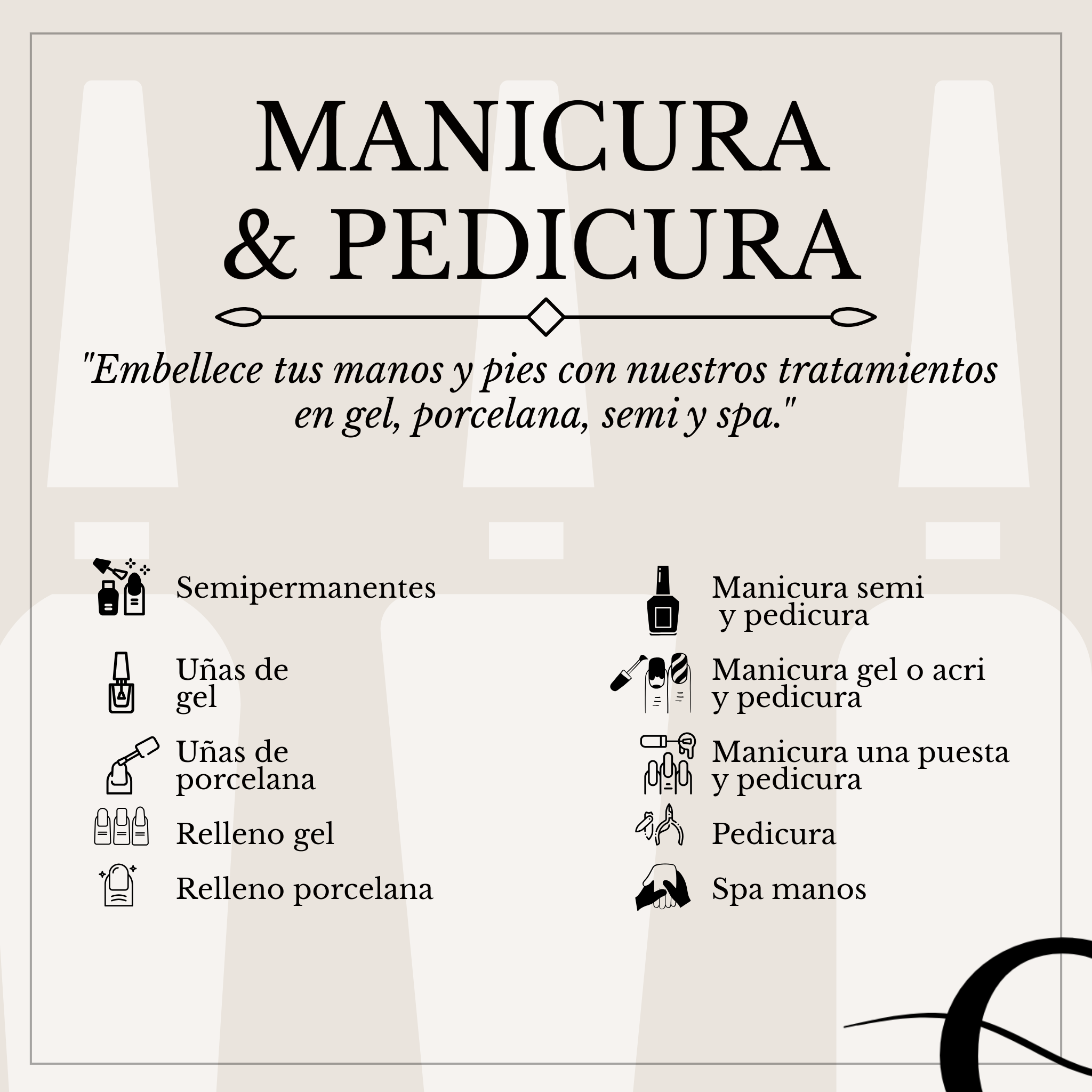 Entre nuestros servicios destacados se encuentran la aplicación de uñas de gel, uñas de porcelana, relleno en gel o porcelana, y esmaltado semipermanente. Además, contamos con tratamientos combinados como manicura y pedicura en gel o acrílico, una puesta completa con pedicura, y opciones de spa para el cuidado intensivo de las manos.